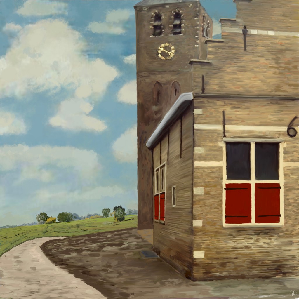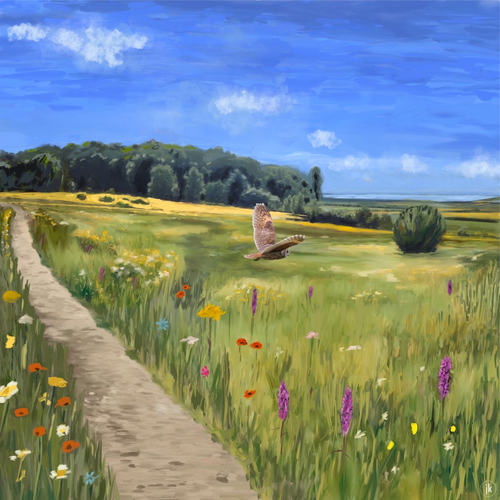 Vanaf wat nu landgoed De Hertgang is, is er dit zicht op de Spinolaberg – genoemd naar de veldheer Ambrogio Spinola – te Halsteren. Ik sta boven op de Brabantse Wal. Beneden mij ligt de Auvergnepolder en nog verder weg de Oosterschelde. Er was hier nog geen industrie. Het is een vergezicht dat voelt als heimwee. De bloemrijke en biodiverse weiden zijn een sier voor het oog. Een kerkuil foerageert en vliegt geruisloos en laag over het land.