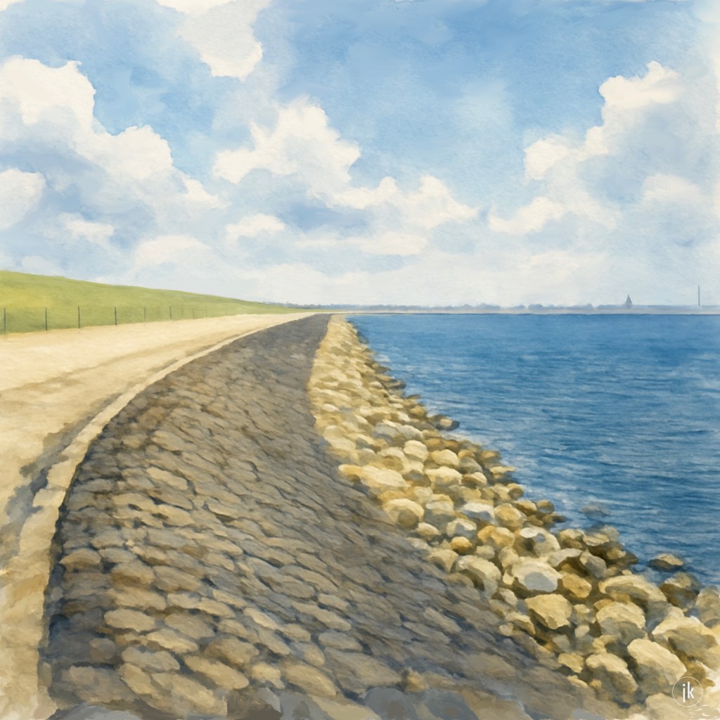 Een dijk, waar het gras ontoegankelijk was. Dat was op het beton zitten. Met in de verte twee boegbeelden van Bergen op Zoom: de spiritusfabriek (‘daar werkt mijn opa!’) en de Sint-Gertrudiskerk (‘dweilen met de Peperbus’). Nog weinig industrie, geen hoogspanningsmasten. In de verte de Brabantse Wal.
