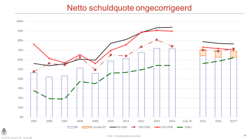 De grafiek laat de nettoschuldquotes van dezelfde groepen gemeenten zien. Nu is te zien dat de grote steden een hoge nettoschuldquote kennen. De daling na 2014 komt door de toevoeging van de baten van het sociaal domein. In de cijfers voor Nederland als geheel is daarvoor gecorrigeerd en is de conclusie dat ten eerste de schuldquotes ten opzichte van 2005 zijn gestegen en dat er na 2014 nauwelijks een afname waar te nemen is van de nettoschuldquote.