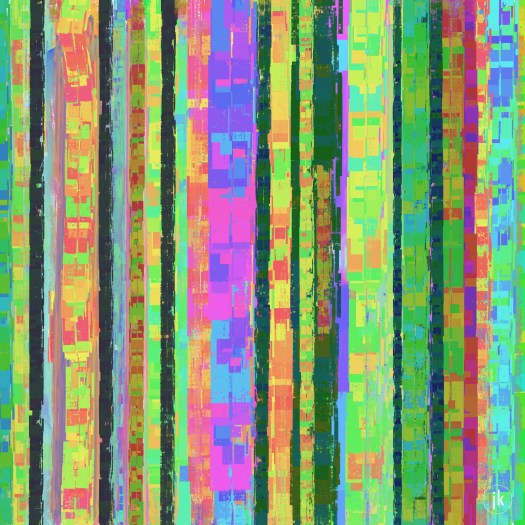 I find myself in a forest with trees all over the place, given me a kaleidoscopic colour palette but no sense where I am and no direction where to go. I try to see the forest for the trees. A personal art impression.