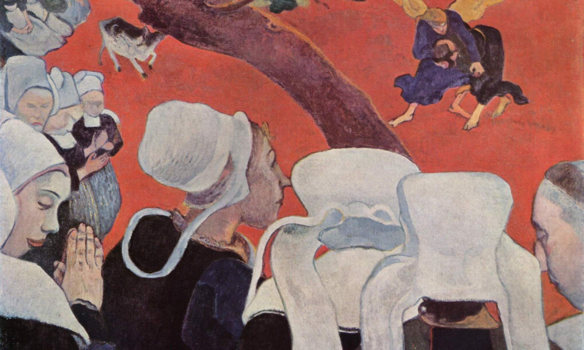 Waar ligt de kern van de gave van Gauguin? Gompertz licht op p.86 een tipje van de sluier op – een deel aan de hand van La Vision après le sermon (1888), te zien op de afbeelding hierboven – wat het volgens Gauguin zelf was: