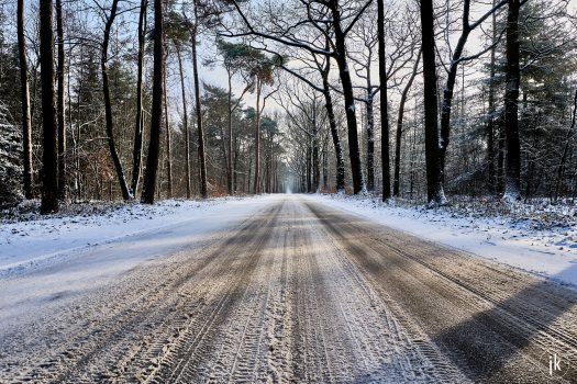This forest road in winter creates the perspective of infinity. Beams of sunlight, shades and shadows merge into one. Is this the road to eternity?
