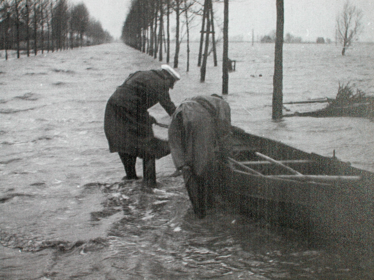 Het water was die nacht 5 meter hoog over de polder gestroomd en huizen en levens van mensen en dieren genomen. Nu staat hij hier op deze ochtend voor een eindeloze zee, met een sloep om uit te varen op zoek naar overlevenden. In de nacht is hij met anderen druk geweest om te doen wat mogelijk was.