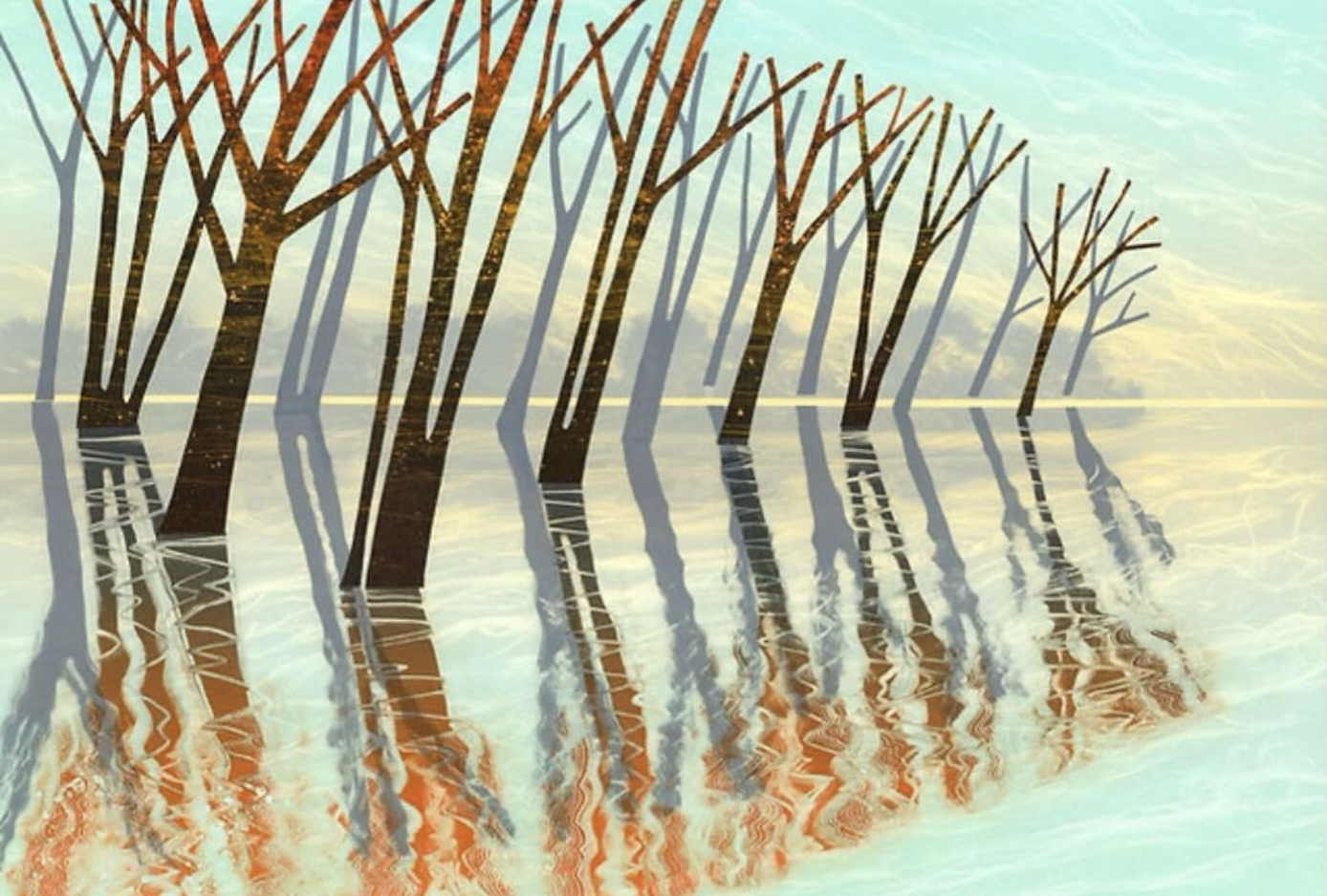 This incredible glicée print strictly gives a metaphorical perspective of nature finding itself in preparation for the year to come. The colourful points of growth reflect themselves in the water. Quite a romantic winter view where resilience shows itself. Go to website Rebecca Vincent.