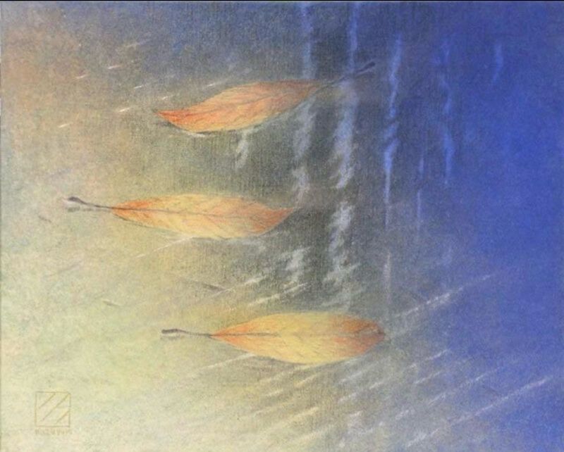 Een prachtwerk van deze Japanse kunstenaar. Een ode aan het blad, dat met zijn unieke capaciteit van fotosynthese van CO2 en water (H2O) zowel zuurstof (O2) als suikers (CH-verbindingen) kan maken en daarmee aan het begin van de voedselketen staat. Het is de maker van het bos, weerspiegelt op de achtergrond.