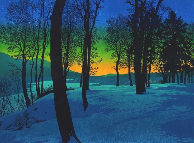 Een meesterwerk. De kleuren verbinden het bos via het oranje van de ondergaande zon, de groene magnetische haze met het blauw van de naderende sterrennacht.