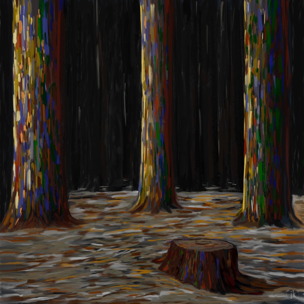 Een impressie. Mijn penseel toont zich als vanzelf. Het begint hier, op deze plek in het bos, waar het zonlicht plots doordringt en zijn regenboog toont. Zelfs voor hen die zijn verwijderd omdat er geen plek meer was, kleurt het licht opnieuw. Het is hier, waar je bomen weer ziet die het bos vormen. Het is hier waar respect voor hen die waren een nieuwe impuls krijgt.