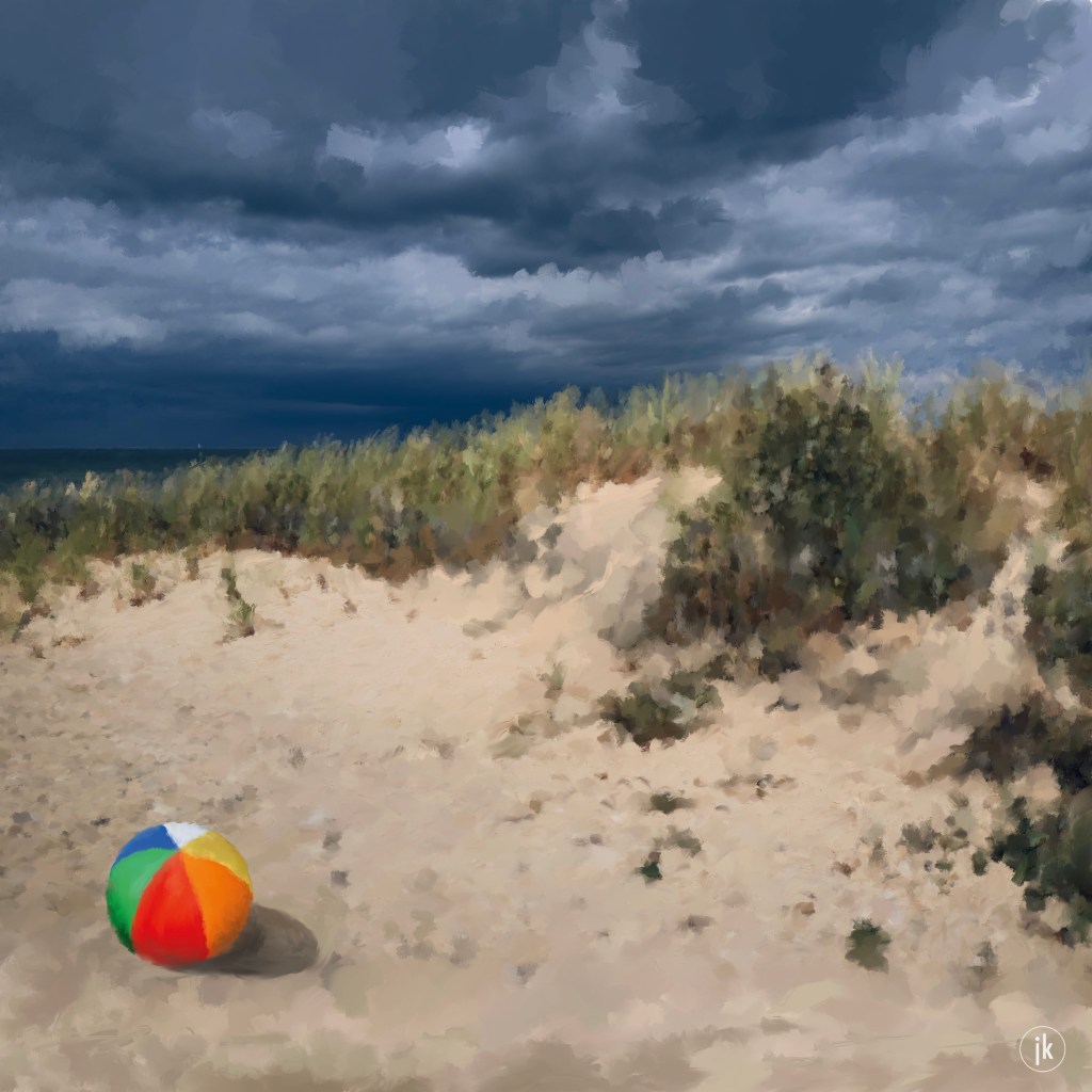 Het was een mooie dag vandaag op het strand. Toen kwamen de wolken. Wij dachten: “Wij pakken in en gaan huiswaarts. Onze strandbal contrasteert zo mooi met de donkere luchten boven zee.”