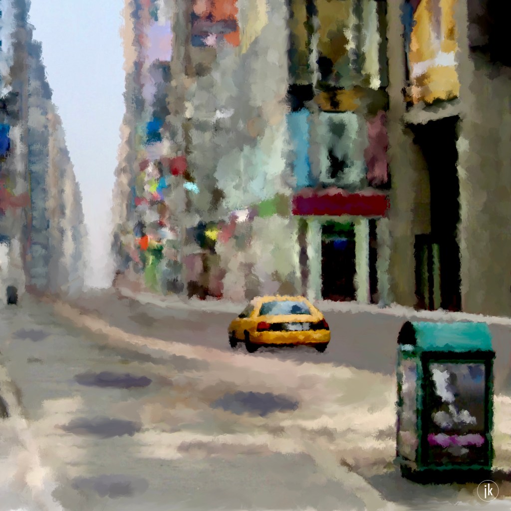Time Square in New York toont haar palette. Een ode aan de afvalbak en de taxi. Met de vele putdeksels naar de onderwereld van de stad, is het bovengronds een schouwspel van kleuren.
