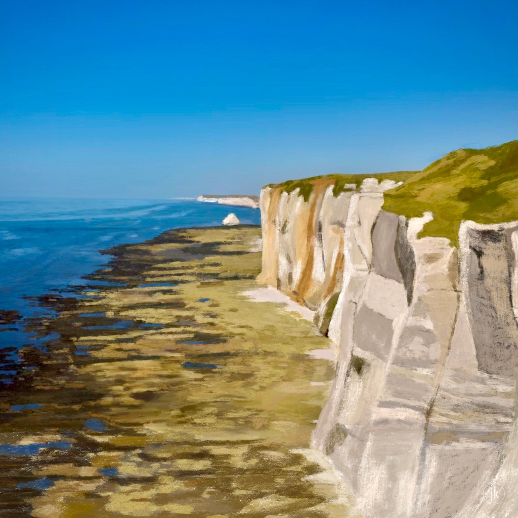 The Normandy coast reveals its structure and colour palette. It is an impressive coastline. Thanks to Louise Kruf for her photo, which served as the basis for this.