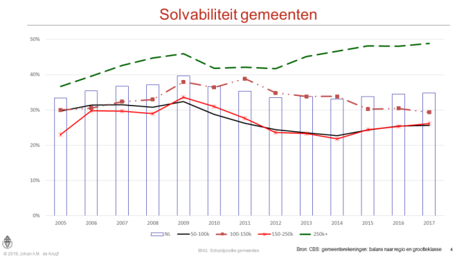 De solvabiliteit van gemeenten tussen 100.000 en 250.000 inwoners ligt lager dan het landelijk gemiddelde. Deze cijfers zijn slechts gemiddelden. Met name in de groep gemeenten tussen 150.000 en 250.000 inwoners zit een substantiële vertekening. In 2017 is de solvabiliteit van deze groep gemeenten omstreeks 27%. Twee gemeenten van de 13 hebben een solvabiliteit van boven 50%. Wordt daarvoor gecorrigeerd, dan daalt de solvabiliteit van de resterende groep naar 18% ofwel met een derde. Die elf grote gemeenten hebben daarmee een solvabiliteitsniveau van ongeveer de helft van het landelijk gemiddelde.