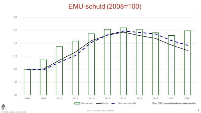 Wanneer de schuld wordt gekoppeld aan het BBP dan profiteert de centrale overheid wel van de groei van het BBP (index 2018: 99% tov 2008) terwijl bij gemeenten het indexcijfer op 107 uitkomt.