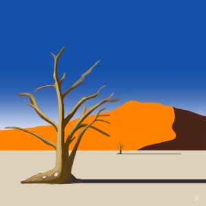 In Deadvlei, these proud acacias still stand. They are believed to have died 600–700 years ago due to changes in river flow, drifting sand dunes and medieval climate changes. They are silent reminders of my dear friend’s noble thoughts and considerations. I found this one in my notebook from our travels through Namibia in 2003 and repainted it.