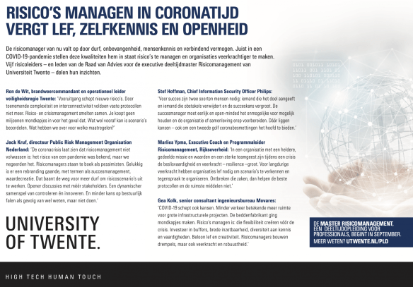 De risicomanager van nu valt op door durf, onbevangenheid, mensenkennis en verbindend vermogen. Juist in een COVID-19-pandemie stellen deze kwaliteiten hem in staat risico’s te managen en organisaties veerkrachtiger te maken.